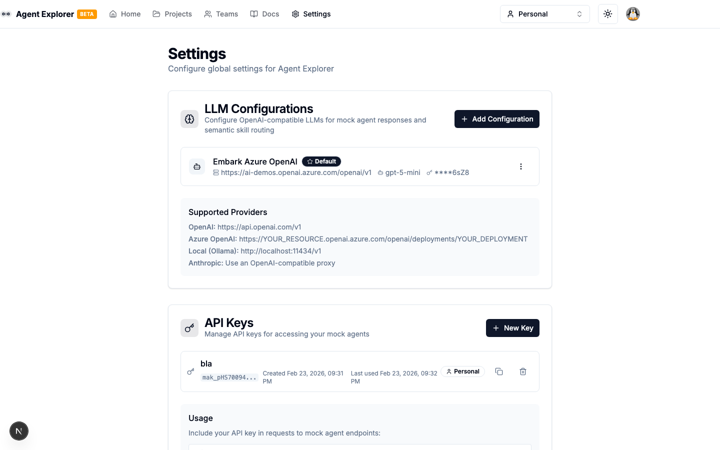 LLM Configurations connect Agent Explorer to OpenAI-compatible language models. They are used by: